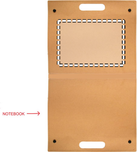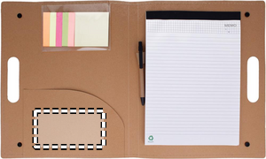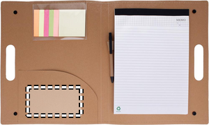 Pahvinen konferenssikansio, sisältää 6 eri väristä muistilappua ja 20 sivuisen muistilehtiön, kuulakärkikynän sinisellä musteella. Painonappikiinnitys.