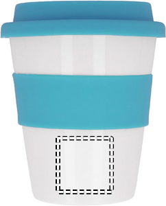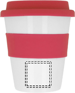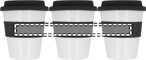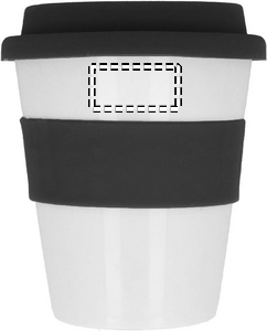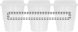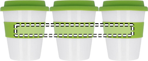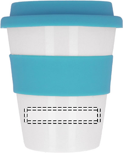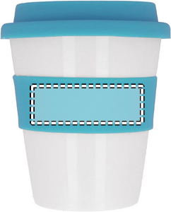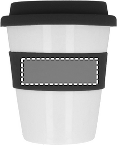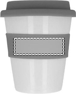 Yksiseinäinen 350 ml PP muki silikonikannella ja -vyötteellä, tuote saattaa kuumentua ulkoisesti käytössä.