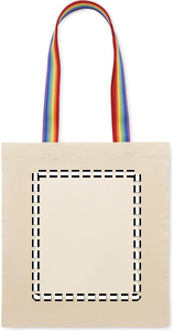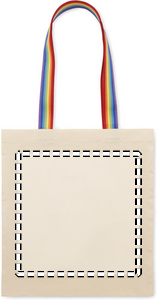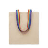 180 gr/m². puuvillainen ostoskassi sateenkaaren värisillä kahvoilla. Kantopainorajoitus 2,5 kg.