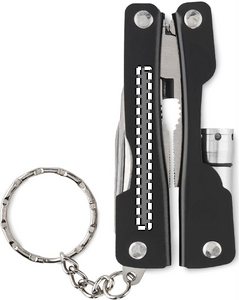 Kokoontaitettava monitoimiveitsi ruostumatonta terästä. Sisältää taskulampun ja 10 työkalutoimintoa sekä 600D-polyesteripussin. Sisältää 3 x AG3-nappiparistoa.