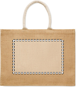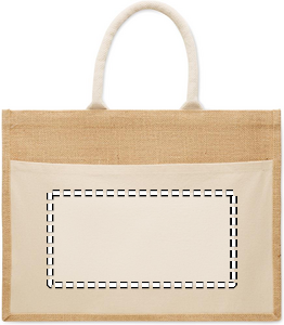 Laminoidusta juutista ja 280 g/m² puuvillakankaasta valmistettu ostoskassi, jossa on nyörikahvat. Mukana suuri avoin etutasku.