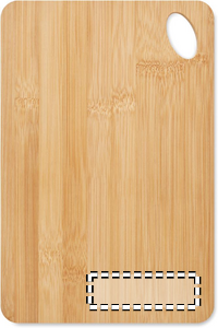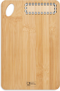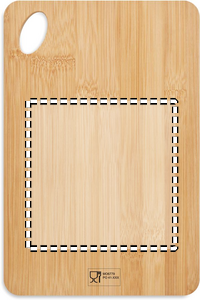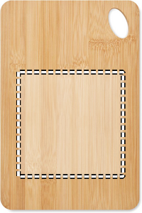 Suuri bambupuinen leikkuulauta, jossa ripustusreikä. Bambu on luonnontuote, joten tuotteiden väri ja koko voivat vaihdella hieman, mikä voi vaikuttaa lopullisen merkkauksen lopputulokseen.