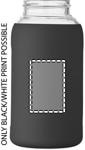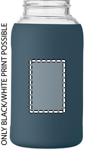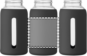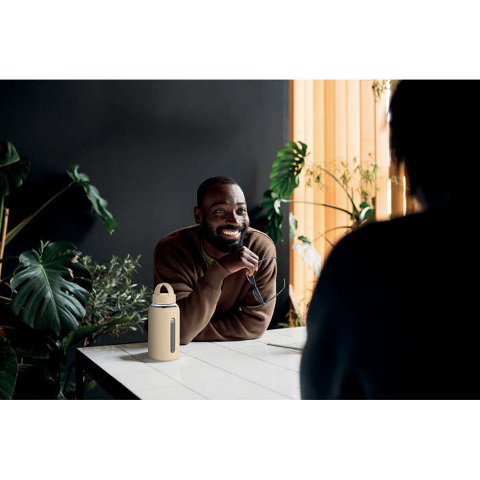 Korkea borosilikaattilasista valmistettu pullo, jossa silikoninen pussi ja kahvallinen PP-korkki. Tilavuus: 600 ml