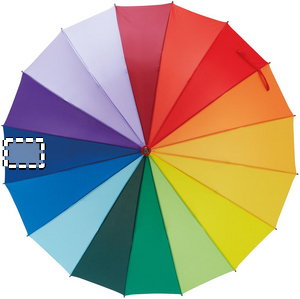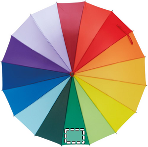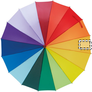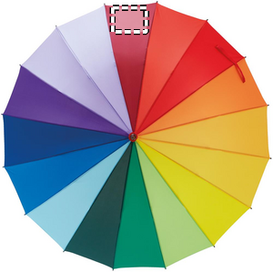 27 inch 16 panel rainbow auto open umbrella in 190T Pongee with wooden shaft, fiberglass ribs, black plated metal tips and top. Use this cheerful and colourful rainbow umbrella to stay dry during the rain. With this design, you will definitely get noticed.