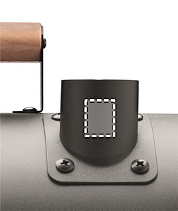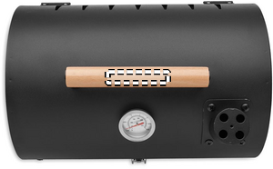 Kannettava grilli, rautaa, savupiippu ja lämpötilamittari. Mustaksi pulverimaalattu tulipesä. Lukitussalpa ja puinen kantokahva.