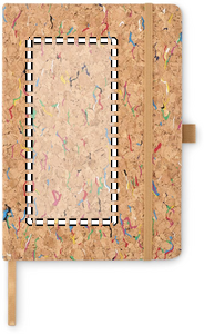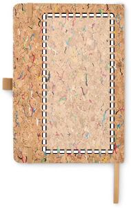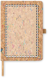 A5-muistikirja, jossa on kova värillinen korkkikansi. Nidottu. 192 viivoitettua sivua (96 arkkia). Joustava sulkuhihna, nauhakirjanmerkki ja joustava kynäpidike.
