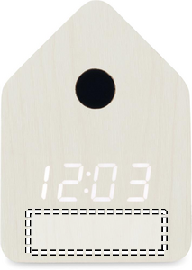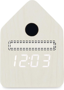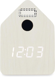 Pieni MDF-pöytäkello, jossa sisäänrakennettu herätys käen kukkuvalla äänellä ja lämpötilanäytöllä. Linnun käen ääni joka täysi tunti ja hälytyksen aikana. Valkoinen LED-näyttö. Ääni mykistyy automaattisesti klo 22.00–06.00. 5 minuutin torkkuvälit.