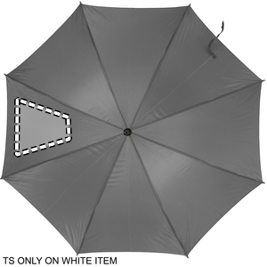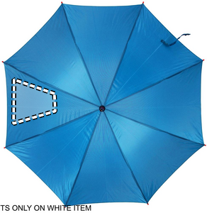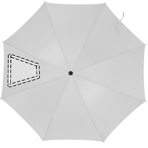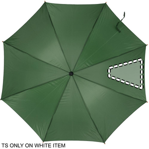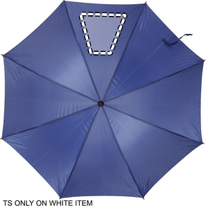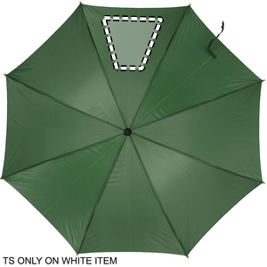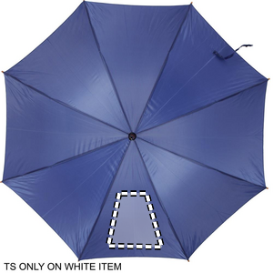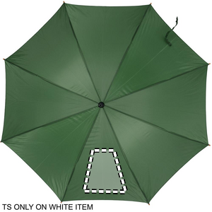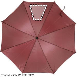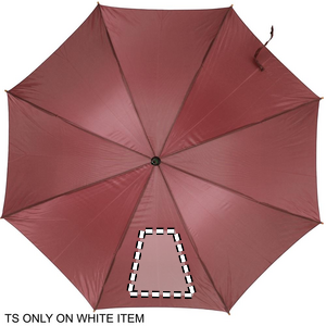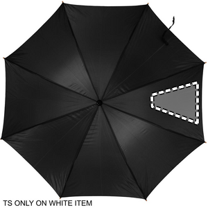 23 tuuman sateenvarjo 190T polyesteriä. Puinen varsi, kärjet ja yläosa. Mustat päällysteet metalli ruoteissa ja kaareva puukahva, automaattinen suljin.