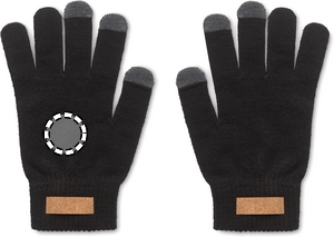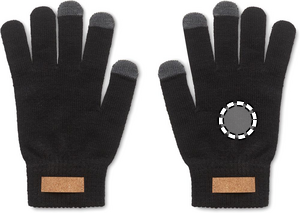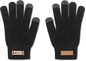Älypuhelimen kosketusnäyttökäsineet RPET-polyesteriä. Käsineissä on korkkia oleva merkki merkkausta varten.