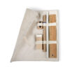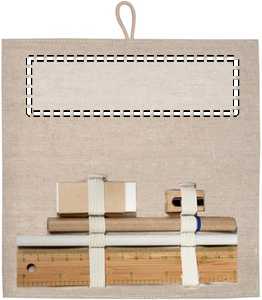 6-osainen toimistosetti, sisältää juutti/puuvillapussin, bambuviivoittimen, puisen teroittimen, pyyhekumin, paperikynän, kuulakärkikynän sinisellä musteella ja pahvisella rungolla.