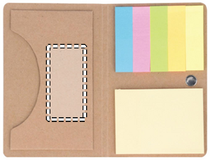 Voimapaperista valmistettu käyntikorttitasku, elastisella sulkuhihnalla. Sisältää keskikokoisen keltaisen muistilappulehtiön tarrapinnalla ja 5 eri väristä indeksi tarralappua.
