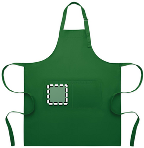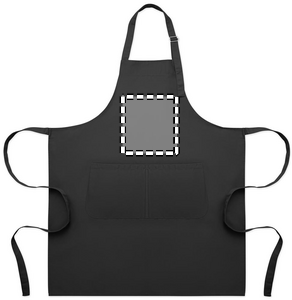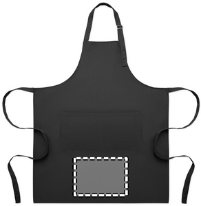 Pitkä, säädettävä keittiöesiliina 240 g/m² polypuuvillaa (35 % puuvillaa, 65 % polyesteriä), jossa kaksi etutaskua ja säädettävä hihna metallisoljella.
