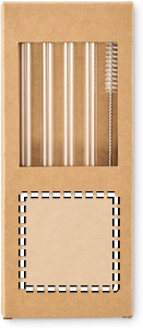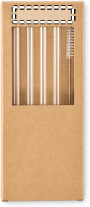 4 uudelleenkäytettävän pillin pakkaus korkeasta borosilikaattilasista ja 1 puhdistusharja.