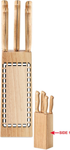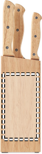 Wooden knife set. Includes base holder and 5 knives: Chef, bread, slicing, multi-functional and paring. Stainless steel with wooden handle.