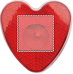 Sydämenmuotoinen ASC-heijastin jossa on punainen valo, ja jossa on takakiinnike. Sisältää 2 LR44-paristoa, jotka voidaan vaihtaa.