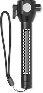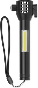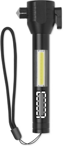 3 in 1 alumiininen taskulamppu hätävasaralla ja turvavyöleikkurilla. Siinä on COB-valo sivulla ja edessä. Sisältää magneetin ja käsihihnan. Mukana sisäänrakennettu ladattava 500 mAh akku.