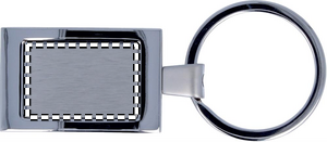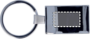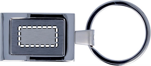 Metallinen suorakulmainen avaimenperä, yksittäispakattuna mustaan lahjapakkaukseen.