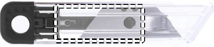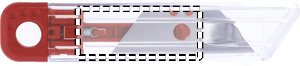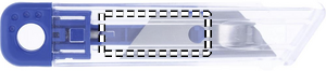 Uudelleen sisäänvedettävä mattoveitsi. Läpinäkyvä runko ja värikkäät yksityiskohdat.