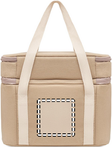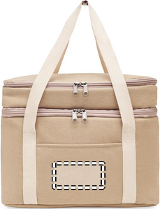 Kylmälaukku, jossa on kaksi lokeroa. Materiaali 320 gr/m² pesty puuvilla canvas, kantohihnat myös puuvillaa. Eristys 15C PEVA ja 6 mm PE vaahtomuovi.