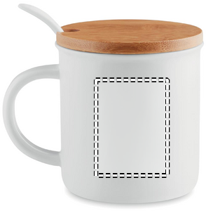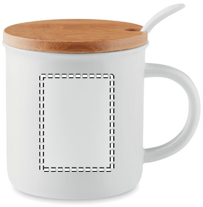 Posliininen 380 ml muki lusikalla ja bambu kannella. Luonnollisen materiaalin (bambu) vuoksi, tuotteiden värissä/ koossa saattaa olla erinäisyyksiä ja tämä voi vaikuttaa painatuksen lopputulokseen.