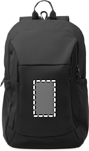 15-tuumainen läppärireppu pehmeästä PU-muovista, jossa pehmustettu selkäosa ja piilotettu vetoketjullinen päälokero. Yksi vetoketjullinen etutasku, kaksi vetoketjullista etutaskua ja kaksi joustavaa verkkotaskua sivuilla. 210D RPET -vuori.