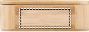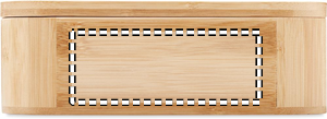 Bamboo lunchbox with removable divider and attachable elastic nylon strap. Capacity 1000ml. Take your home made lunch with you to work in this natural looking, bamboo lunchbox. With the divider you can take two different types of food or ingredients with you without them mixing together. The nylon strap keeps the box shut while being carried. This lunchbox is suitable for dry food only. Bamboo is a natural product, there may be slight variations in colour and size per item, which can affect the final decoration outcome.