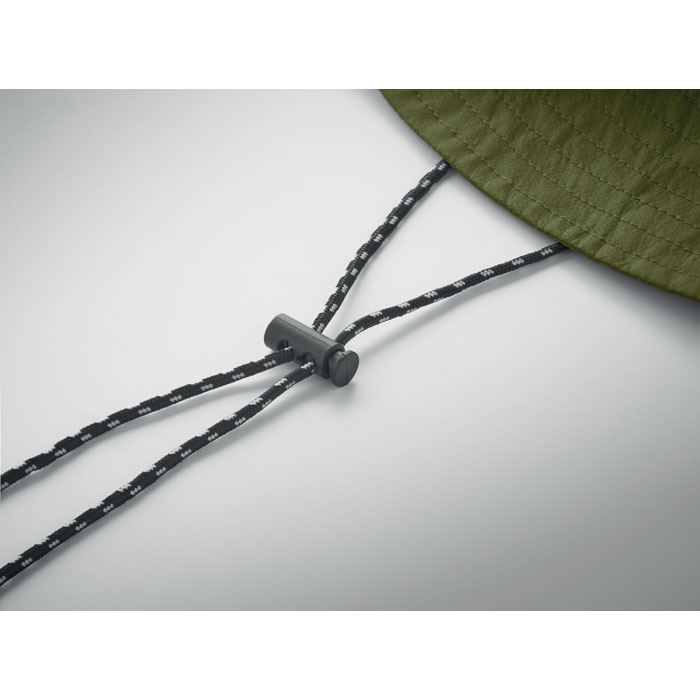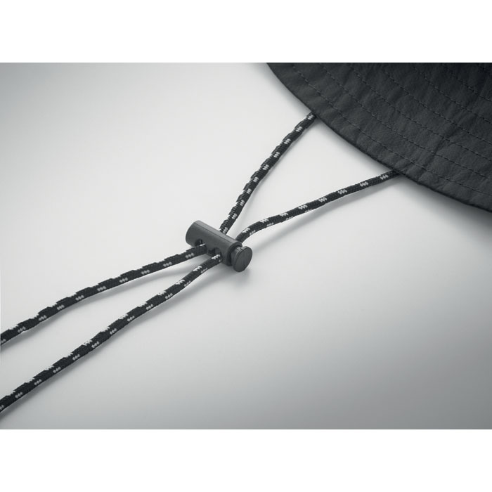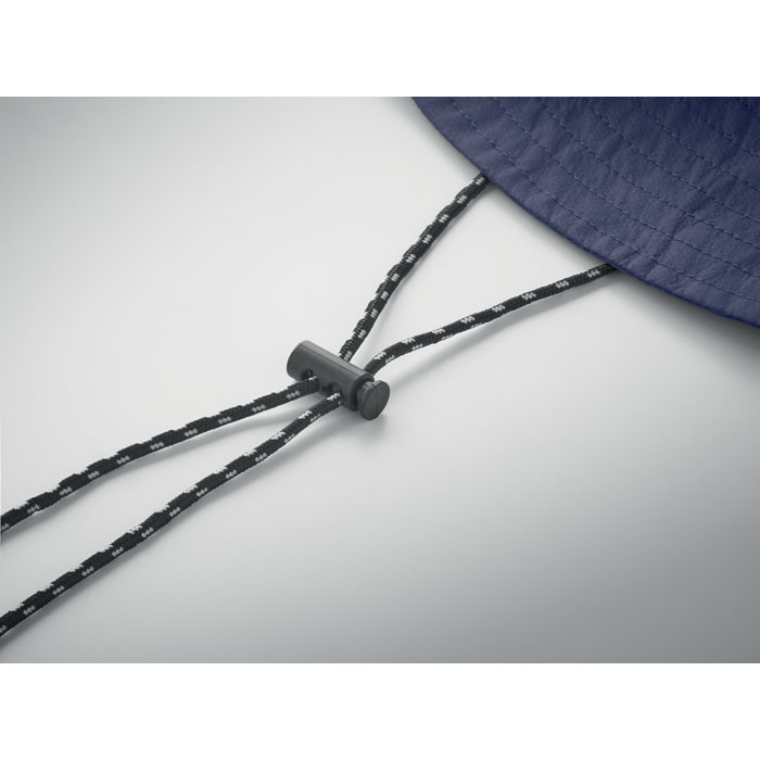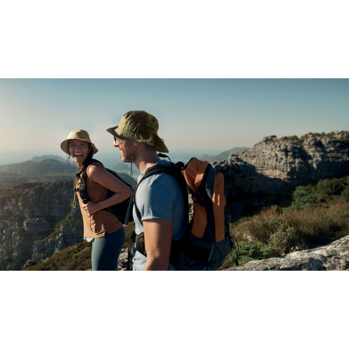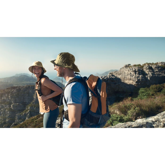 Vettähylkivä kalastajanhattu polyesteristä, mukana oma säilytyspussi ABS-karabiinilla. 64 g/m².