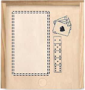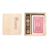 Pelisetti, sisältää 54 pelikorttia ja 5 noppaa, pakattuna puulaatikkoon.