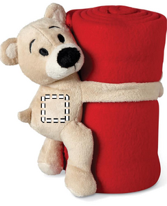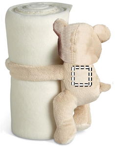 Lasten fleecehuopa, nallekarhulla pitää peiton rullalla kiinnitysnauhakäsillä.