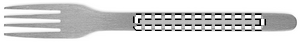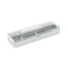 Ruostumattomasta teräksestä valmistettu aterinsetti PP-kotelossa. Tämä setti sisältää haarukan, veitsen ja lusikan.