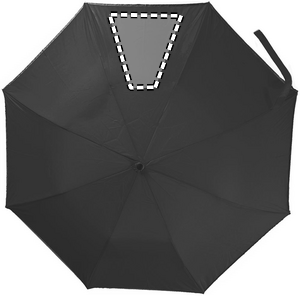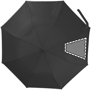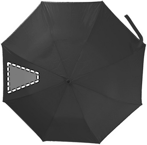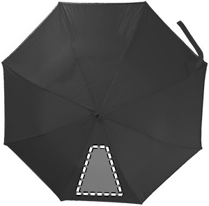 190T-pongee 2 osainen 21 tuuman sateenvarjo, automaattiavauksella. Sinkillä pinnoitetut teräsvaris, ruoteet ja kärki. Paneelien reunat heijastavalla verhoilulla, musta muovikahva rannehihnalla. Sisältää saman värisen säilytyspussin, manuaalinen suljin.