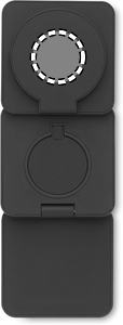 3 in 1 kokoontaitettava latausasema kumitettua kierrätettyä ABS-materiaalia. Se sisältää magneettisen langattoman laturin 15 W, älykellolaturin (vain Apple®) ja TWS-laturin.