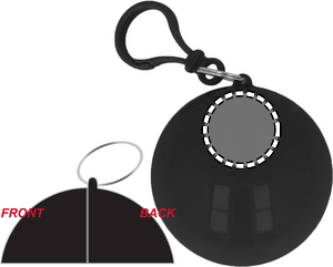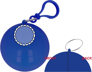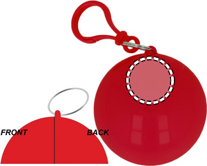 Läpinäkyvä PE-sadeviitta pakattuna AS-muovi palloon. Pallossa karabiinikouku, karabiinikoukkua ei ole tarkoitettu kiipeilyyn.