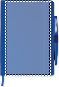 A5-muistikirja kartonki kannella, 72 sivua viivattua paperia, kuminauhalla ja kirjanmerkkinauhalla. Sisältää metallisen kuulakärkikynän sinisellä musteella. FSC MIX CREDIT | P7.1 | FSC-C213206