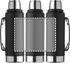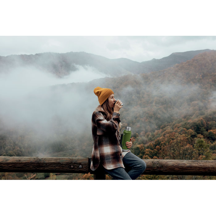 Kaksinkertainen tyhjiöeristetty pullo kierrätetystä ruostumattomasta teräksestä (90 % kierrätettyä ruostumatonta terästä ja 10 % ruostumatonta terästä), kahva sivulla. PP-kansi ja kierrätetystä ruostumattomasta teräksestä valmistettu kuppi. Vuotamaton. Tilavuus: 1 l.