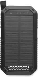 Solar charger with built-in light functionality. This 8000 mAh power bank has a rechargeable Lithium battery and can charge your smartphone or mobile device wherever you are. Thanks to the solar panel, it will charge itself when exposed to sun or daylight. 21 LED lights will turn this device in to a flashlight when needed. An ideal gift for adventurers and camping enthusiasts. Includes an USB-cable and micro-USB plug.