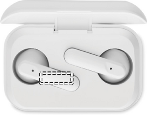 ABS-muovista valmistetut True Wireless Stereo (TWS) 5.3 langattomat stereokuulokkeet, joissa on mikrofoni ja sisäänrakennettu 30 mAh akku. Kuulokkeissa on varaustason LCD-näyttö. Automaattinen pariliitos. Mukana C-tyypin latauskaapeli ja 250 mAh latausasema.