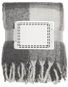 Ruudullinen mohair- RPET polyesterihuopa, jossa on käsin rullattuja hapsuja. Kääritty nauhaan ja tulostettavaan korttiin.