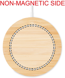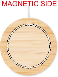Magnetic bamboo wireless charger. Output: DC 9V/1.1A (10W) for quick charging. Compatible with iPhone® 12 and newer. Including additional magnetic metal ring to support charging of other non-magnetic wireless chargeable phones.