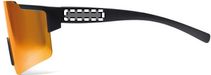 Urheiluaurinkolasit peililinsseillä ja mustalla kehyksellä. UV400-suoja.