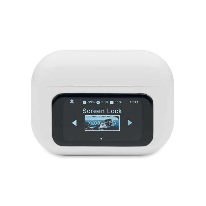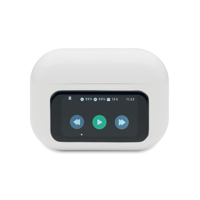 Kierrätetystä ABS-muovista valmistetut langattomat True Wireless Stereo (TWS) 5.0 -stereonappikuulokkeet (30 mAh), joissa ANC/ENC ja mikrofoni sekä 230 mAh:n latausalusta. Kosketusnäyttö.