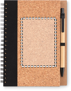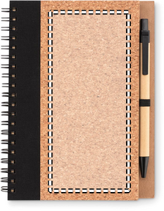 Muistikirja pehmeällä korkki kannella, 140 viivoitettua sivua (70 arkkia) ja kierrätetty kuulakärkikynä mustalla musteella. Kynän runko on valmistettu kierrätetystä kartongista, yksityiskohdat valmistettu maissi PLA. Korkki on luonnonmateriaali, strukturaalinen laatu ja pinnan huokoisuus voi aiheuttaa eroavaisuuksia tuotteissa painatuksen jälkeen