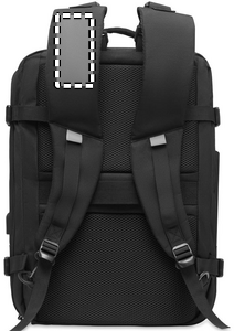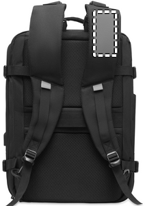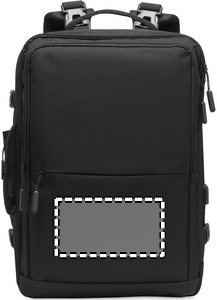 Travel Tech -reppu 600D RPET-polyesteriä. Repussa on useita lokeroita ja taskuja.