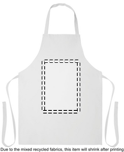 Kierrätetty esiliina 180 gr/m² (70 % kierrätettyä puuvillaa ja 30 % RPET-polyesteriä) . Tämä tuote voi kutistua painamisen jälkeen.