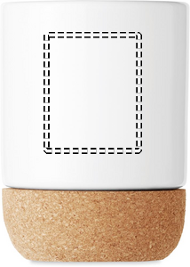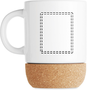 Ceramic mug with special coating for sublimation print and cork base detail. Individual packing in white carton box. Capacity: 300 ml