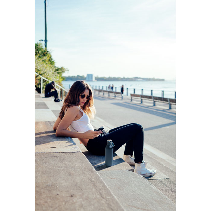Yksiseinäinen pullo, joka on valmistettu 90 % kierrätetystä ruostumattomasta teräksestä ja 10 % ruostumattomasta teräksestä, kumipinta. Mukana PP- ja SS-kansi silikonikahvalla. Tilavuus: 500 ml.