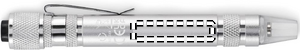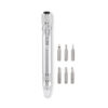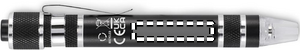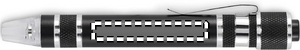 Kierrätysalumiinista valmistettu kynän muotoinen monitoimityökalu, jossa on taskulamppu. Sisältää 3 uraruuvimeisselin ja 3 Phillips-ruuvimeisselin päätä. mukana 4 nappiparistoa LR41.