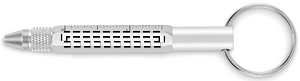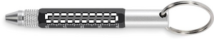 Avaimenperä kierrettävällä kynällä kierrätysalumiinista, jossa on 4 cm:n ja 1,5 tuuman viivoitin, stylus ja 2 in 1 -kantainen piikki- ja litteäpäätyinen ruuvimeisseli. Musta muste.
