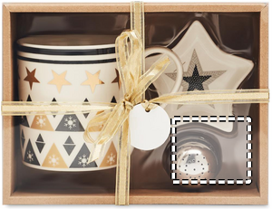 Keraaminen lahjasetti, sisältää keraamisen mukin, teesiivilän ja mini lautasen. Pakattuna kartonkiseen pakkaukseen.