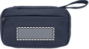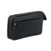 Toilettilaukku 600D RPET -materiaalista, PU-pinnoite, RPET-verkkokangas ja 210D RPET-vuori. Edessä vetoketjullinen päätasku, sisäpuolella verkkokangasta ja avotaskuja.